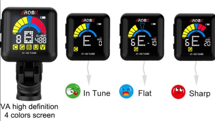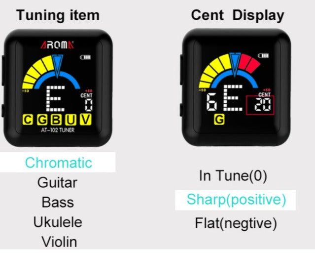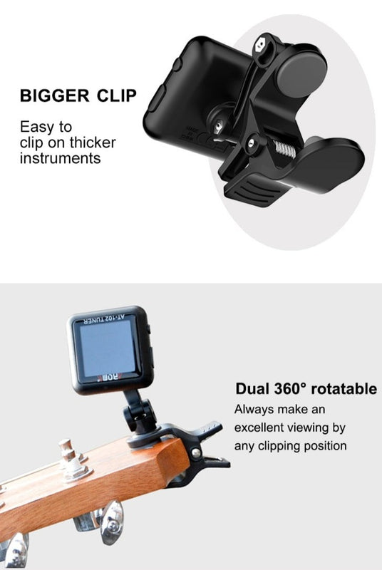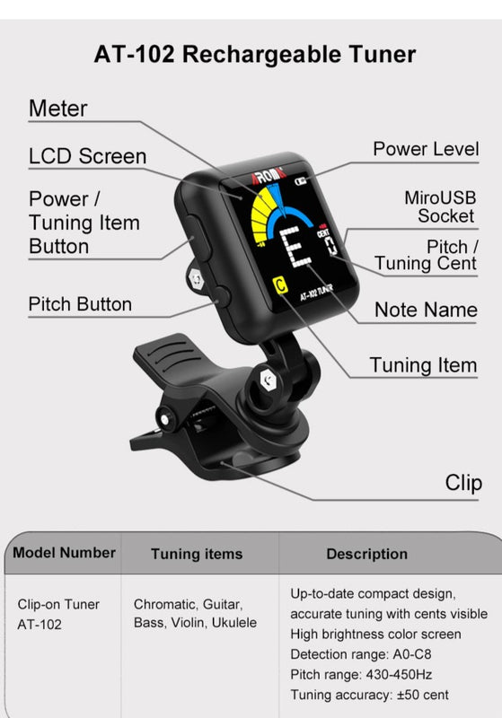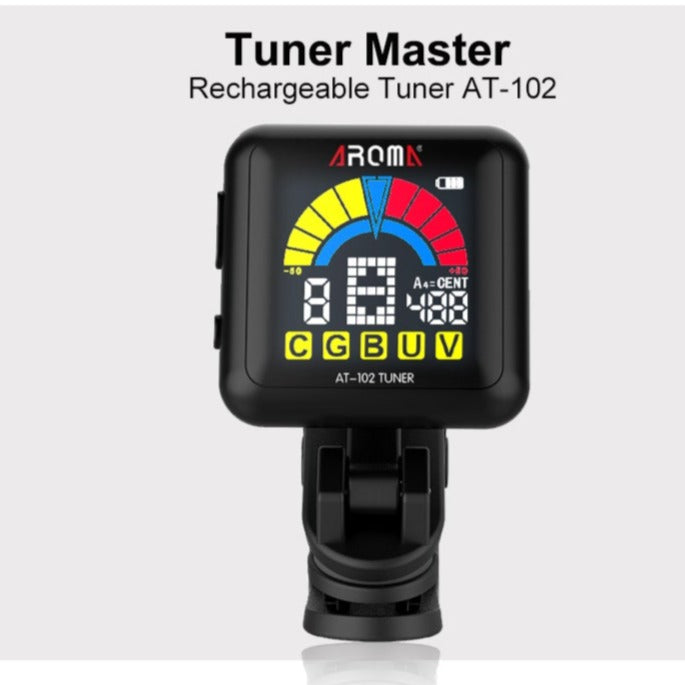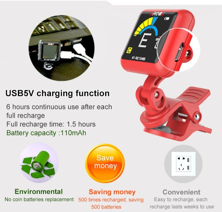 A great rechargeable digital clip-on tuner from Aroma! Recharge via USB for up to 6 hours of continuous use after a full 1.5 hour recharge.