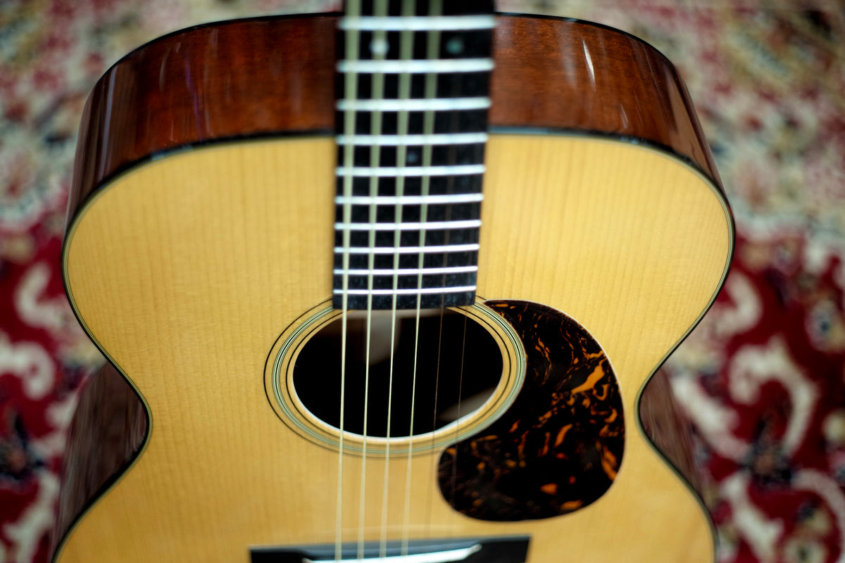 The 000-18 Marquis is truly reminiscent of vintage 1930s era Martins, in look, tone and "handmade" feel. Back and sides are crafted of solid mahogany; tops are Adirondack red spruce with scalloped 5/16" Adirondack Golden Era style braces. The 000-18 has a 24.9" scale, and features 1-3/4" modified V neck with Madagascar rosewood headplate, ebony fingerboard and "Old Style 18" position markers.