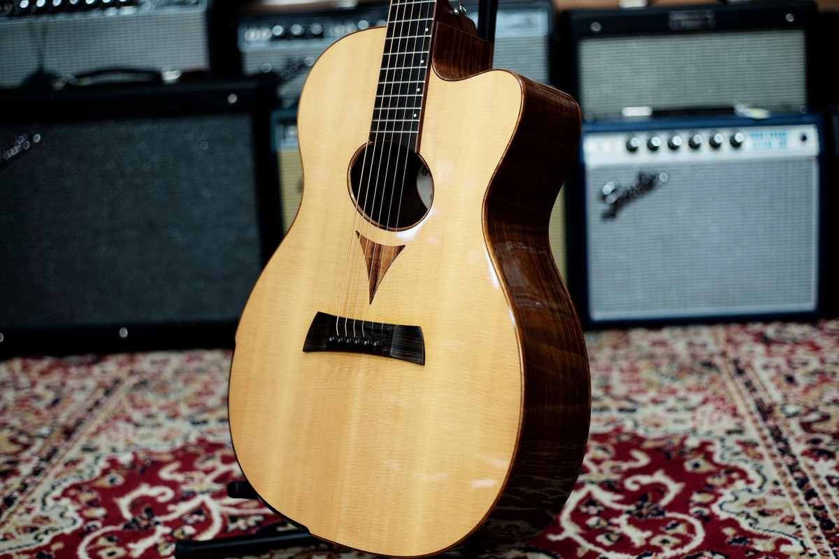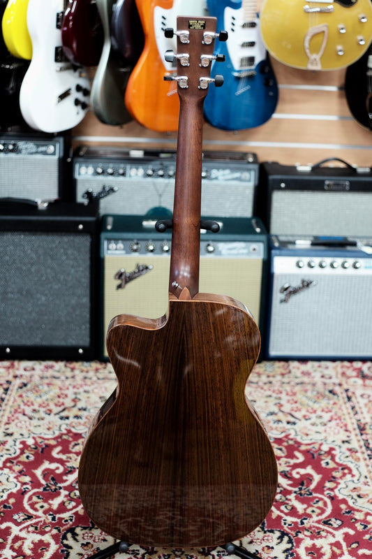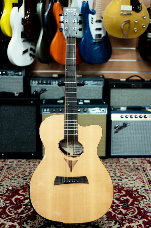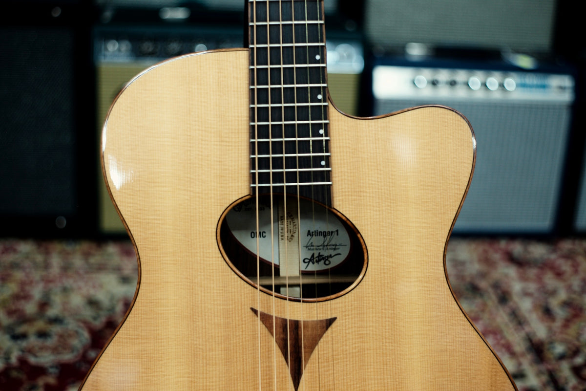 This unusual acoustic-electric cutaway guitar was developed in collaboration with luthier Matt Arranger, who has gained recognition for his bold instrument designs. Based upon Martin's "OM" Orchestra Model shape, this Special Edition features East Indian rosewood back and sides and a Sitka spruce top, but that's where the tradition ends! The body is artfully bound with figured Hawaiian Koa and includes a comfortable black arm bevel. An elliptical sound hole is also bound in laser-cut Koa and tipped to an oblique angle, and a special oval sound port on the bass side provides presence for the player. The ebony bridge and 22-fret fingerboard contouring are also unique. Each OMC Artinger 1 is stage ready with an installed Martin Gold Plus Natural I pickup.