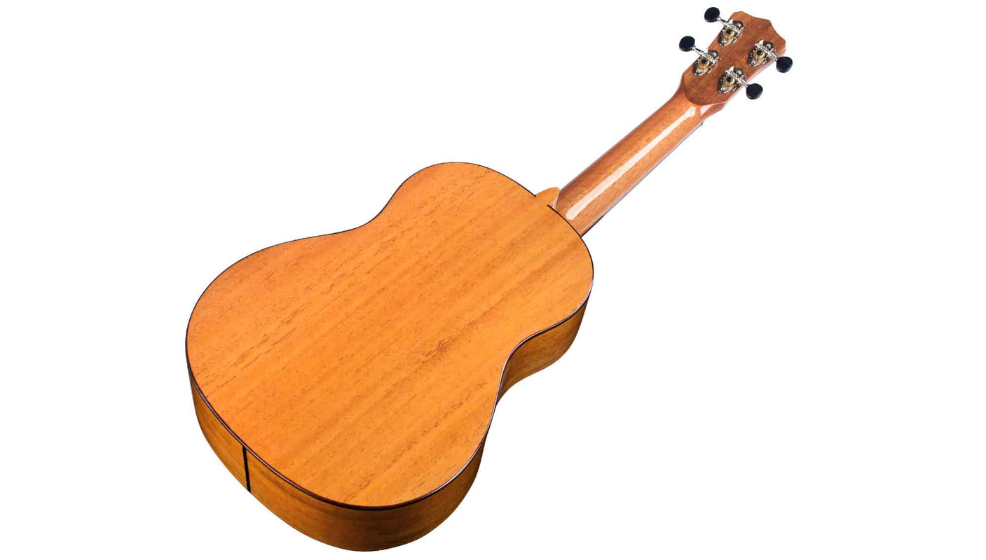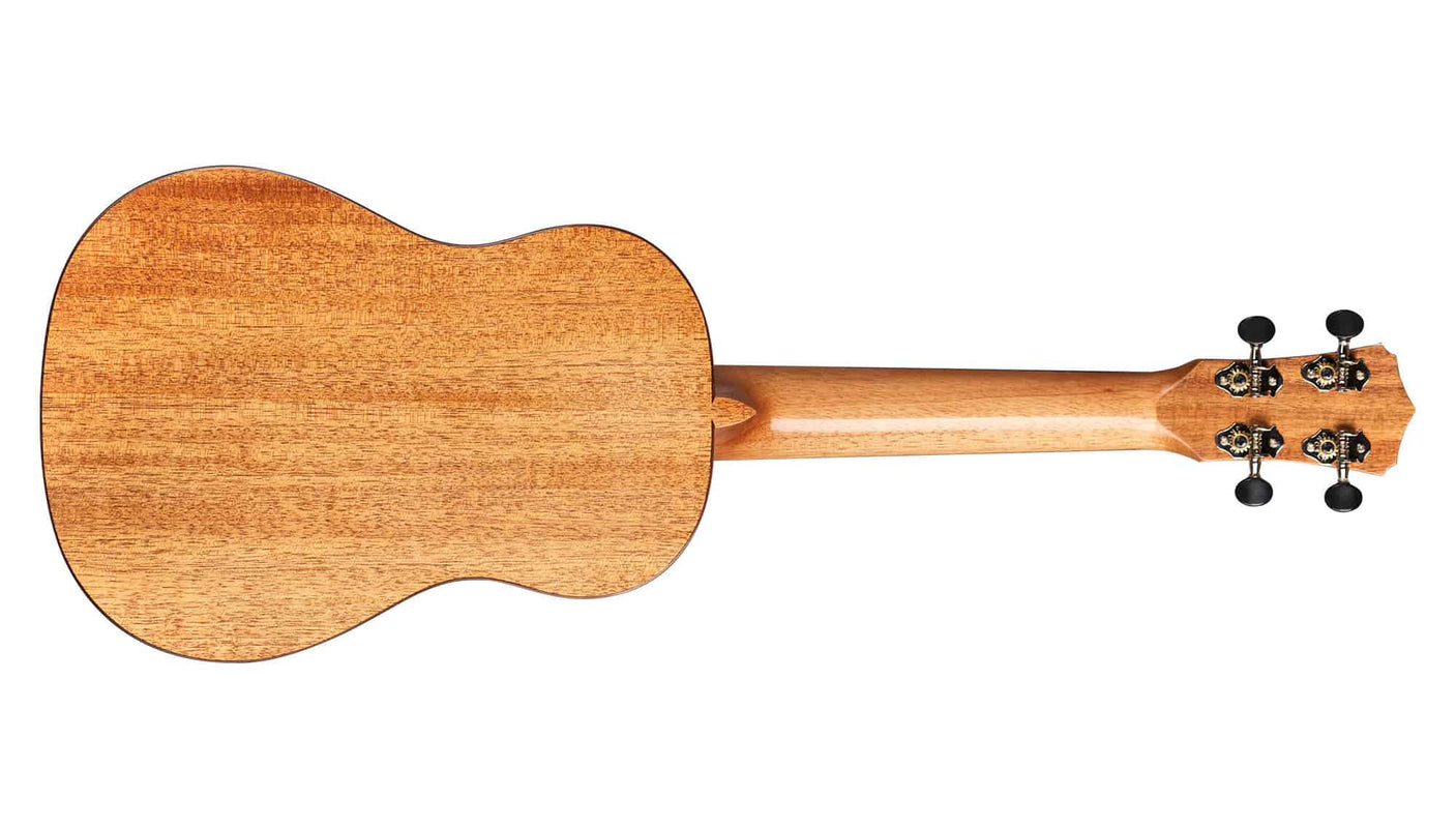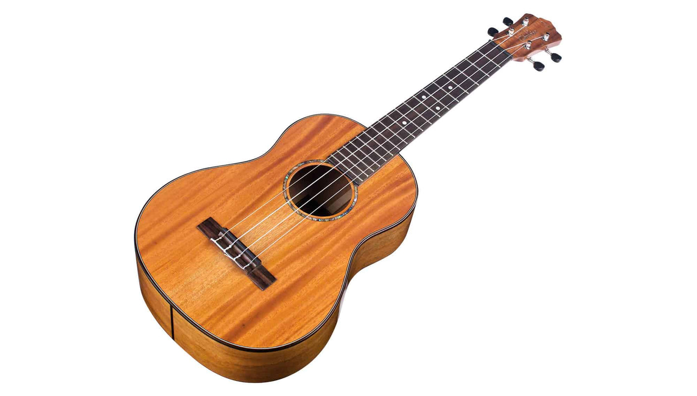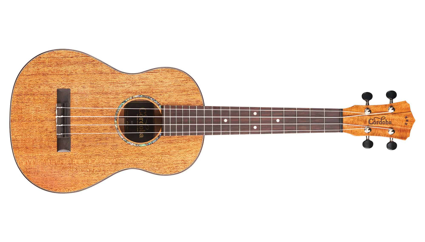 The 30T tenor uke is an extremely lightweight instrument that features the classic combination of a solid mahogany top, back and sides, giving it a warm and balanced sound. It also has a beautiful rosewood bridge, binding, and fingerboard. The styling is refined and sleek, using abalone for the inlaid rosette and rosewood for the binding, capped off with Cordoba’s signature elevated headstock with a figured acacia overlay. The finish is a gloss polyurethane, applied as thinly as possible for maximum resonance. Other features include a black TUSQ® nut and saddle, chrome Grover tuners, and a Cordoba polyfoam case.