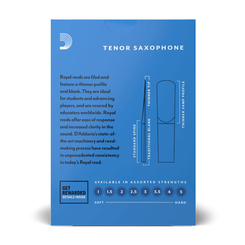 Royal by D'Addario Strength 1.5 tenor saxophone reeds feature a thinner profile and blank. These filed reeds offer ease of response and increased clarity in the sound. They are ideal for both students & advancing players.