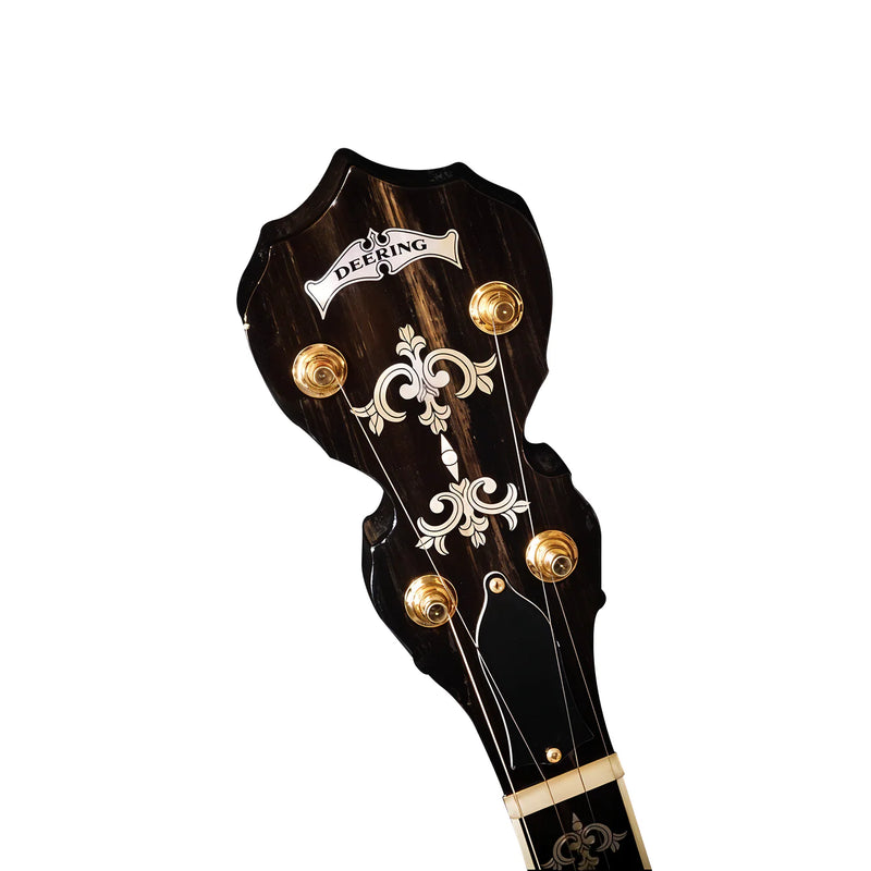 The bound ebony fingerboard and ebony peghead overlay feature intricate gold mother-of-pearl inlays, including a distinctive 50th Anniversary banner. Complemented by gold-plated planetary tuners with cream buttons and a Deering Smile bridge, this banjo exudes refined elegance.
