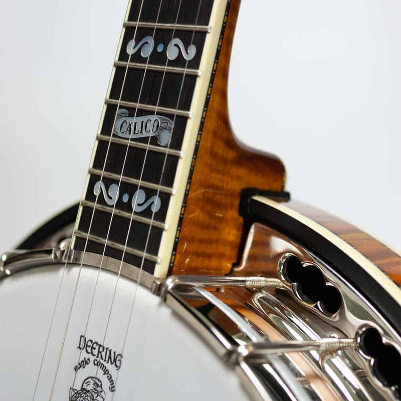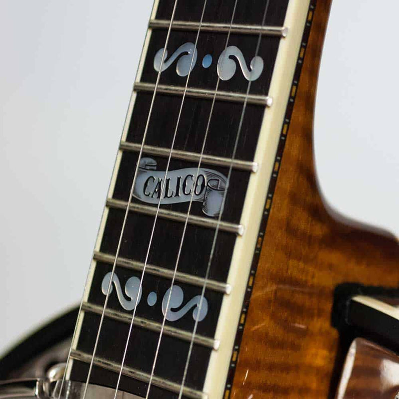 A premium quality world class 5-string banjo that is appreciated for its crisp tone with great highs and distinctive bass response. The Calico is not only beautiful, but it is also exceptionally dynamic with both powerful sound and response providing an excellent tool for all styles of music. At this price point we add two features, we taper the inside of the resonator walls for added projection of tone, and we also add the feature of glued-in frets. Each fret is fitted to the fingerboard and glued in place so that in the future when the frets are worn out, they can easily be replaced without chipping the fingerboard. You will gain these benefits on every model from the Calico on up the line.