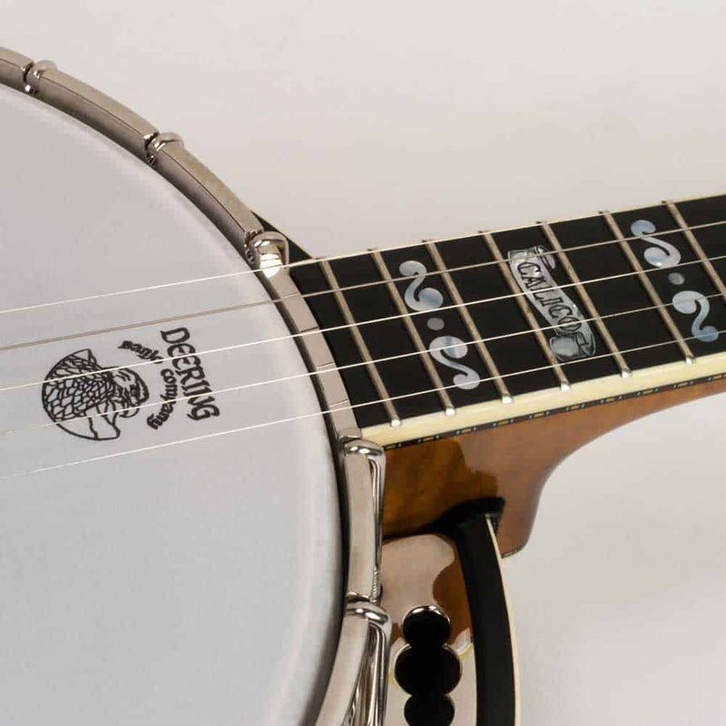 The heart of the Deering Calico banjo is the Deering bronze tone-ring, precisely fitted to the three ply maple rim. The Deering -06- tone ring produces a beautiful, balanced overtone spectrum. Its weight is ideal for most styles played on the banjo. A softer touch will provide you with as much sustain as you ever want, a sharper attack will produce a distinct pop and accurate note separation. You will notice no dead spots over the entire fingerboard. The beautiful highs and powerful well rounded bass is the result of intense study of alloys and shapes resulting in superb sound.