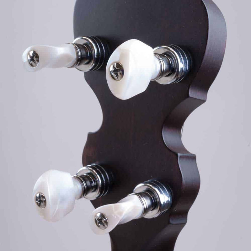 The Artisan Goodtime Special has the look of an older banjo with the rich brown stain, Deering fiddle shaped peghead and planetary banjo tuners. The Artisan Goodtime Special can be heard with a sweet voice with sustain that complements all the instruments in a band. Tuned to an open G Chord, with the spikes already installed, you can easily play in other keys.