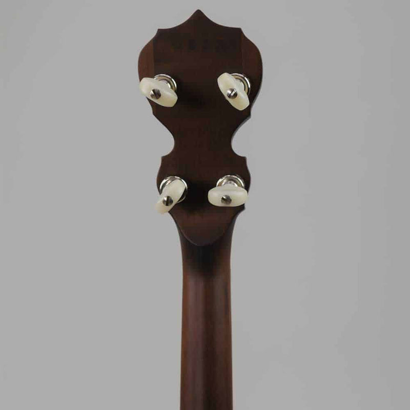 With a bluegrass resonator back for projection, the Artisan Goodtime Two banjo has a 3-ply violin grade maple rim and produces a bright and clear tone that projects well and is louder than its open back counterpart. The Artisan Two is enhanced with a rich brown stain, white detailing and spikes at 7, 9, and 10. The use of spikes enables you to expand your playing from the key of G to easily play in the keys of A, B, and C.