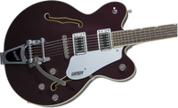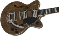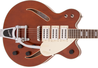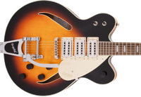 The G5655TG Electromatic® Center Block Jr. Single-Cut with Bigsby® and Gold Hardware features a smaller-sized body with a chambered spruce center block for dynamic resonance, high gain power and lightweight comfort.