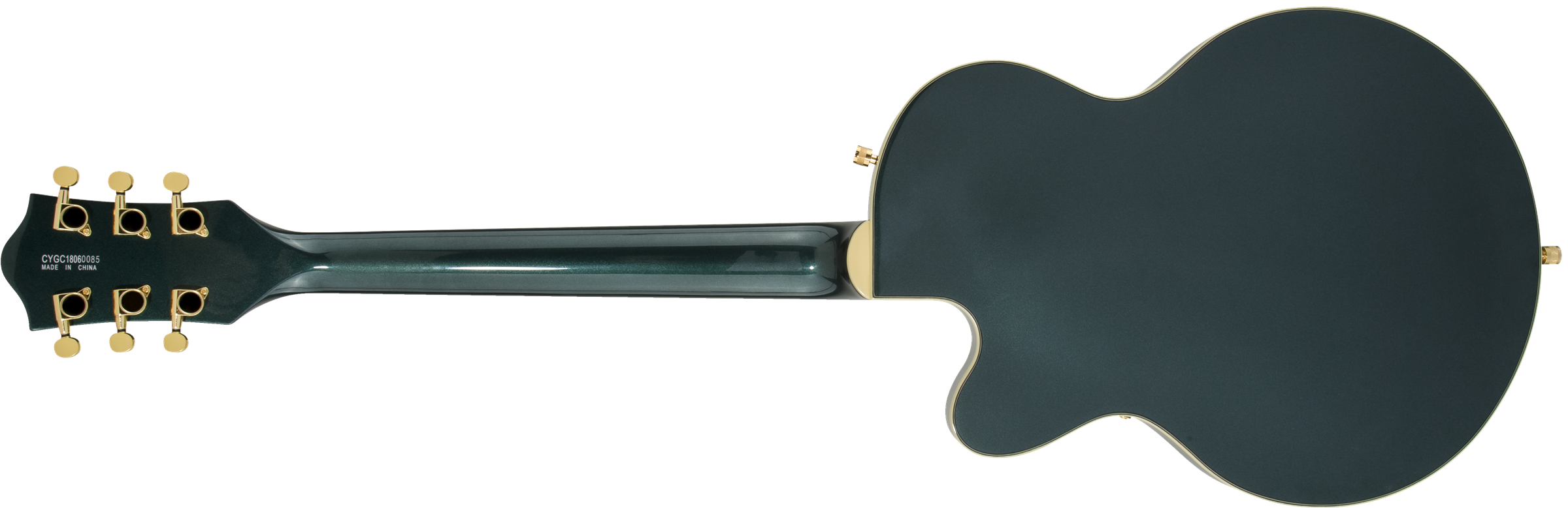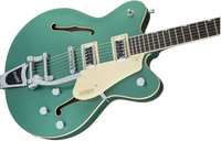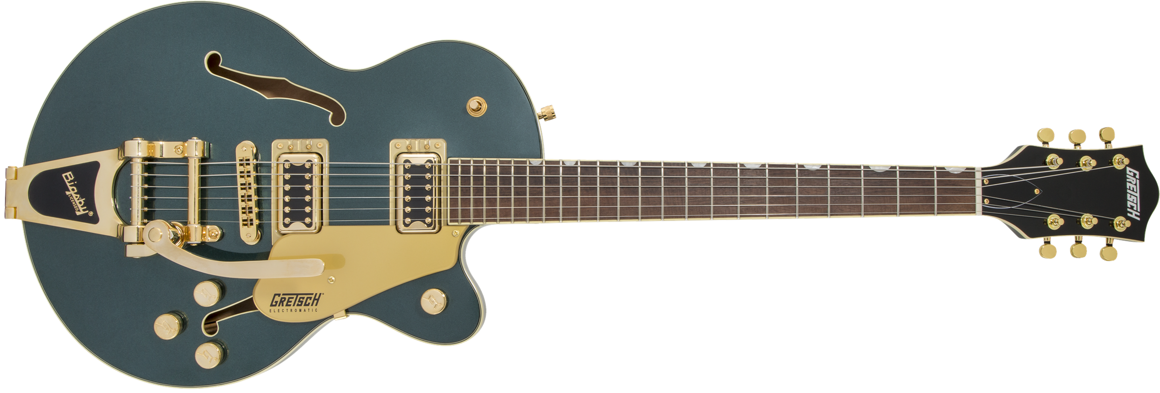 This guitar boasts stage-stealing style with it's Cadillac Green, gleaming gold pickguards and hardware, including the Bigsby® B70 vibrato tailpiece, anchored Adjusto-Matic™ bridge and G-arrow knobs.