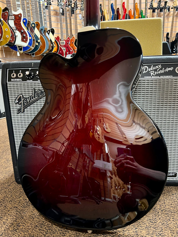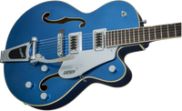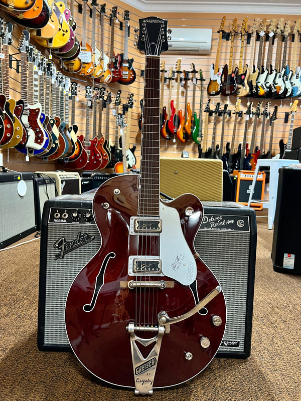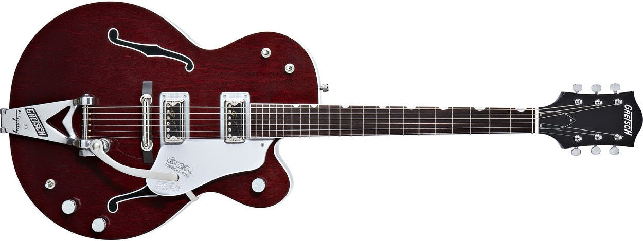 Unique Features:Neo Classic "Thumbnail" Inlay Position Markers, Zero Fret, Black Headstock Overlay, Bound Fingerboard and Headstock, Multiple Body Bindings, Simulated F-Holes, Silver Plexi Pickguard with Embossed "Chet Atkins" Signature, Knurled Strap Retainer Knobs, Adjustable Truss Rod