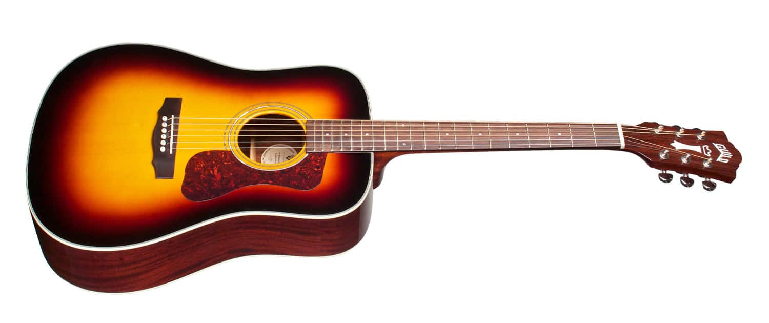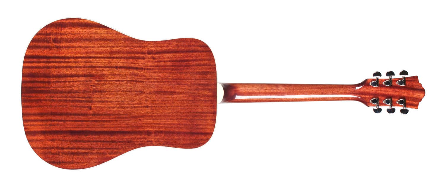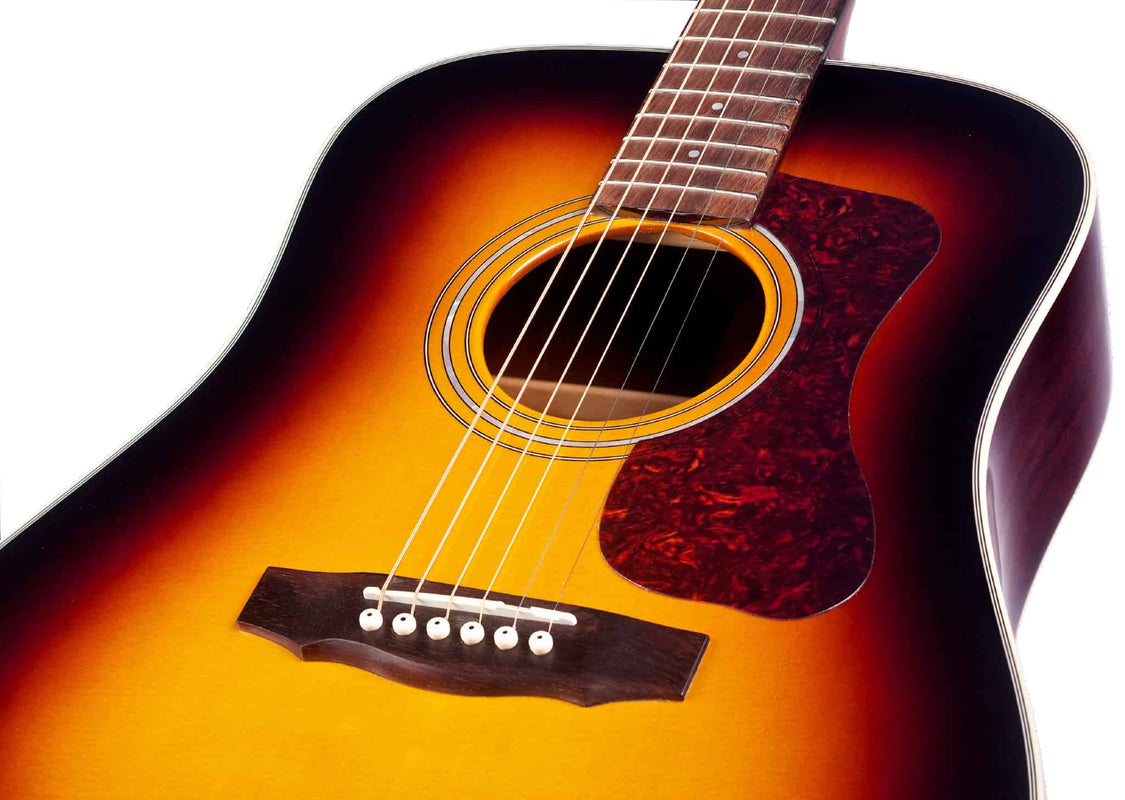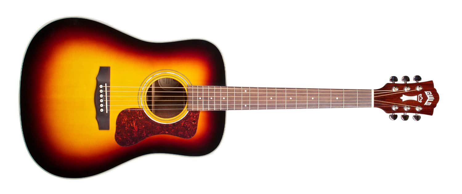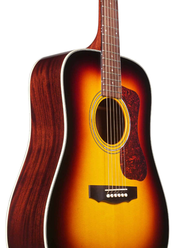 The full-bodied and powerful tone of this Guild dreadnought provides guitarists with a classic acoustic sound and balanced voicing. Built with a solid Sitka spruce top and solid African mahogany back and sides, the D-140 features an Indian rosewood fingerboard and bridge, bone nut and saddle, and a mother-of-pearl rosette. This model also has a 1¾” nut width on a vintage shaped Guild neck, iconic Chesterfield headstock emblem reminiscent of 1960s Guilds, period-correct tortoiseshell pickguard, and Guild’s new lightweight polyfoam case. Available in Natural or Antique Sunburst gloss finish.