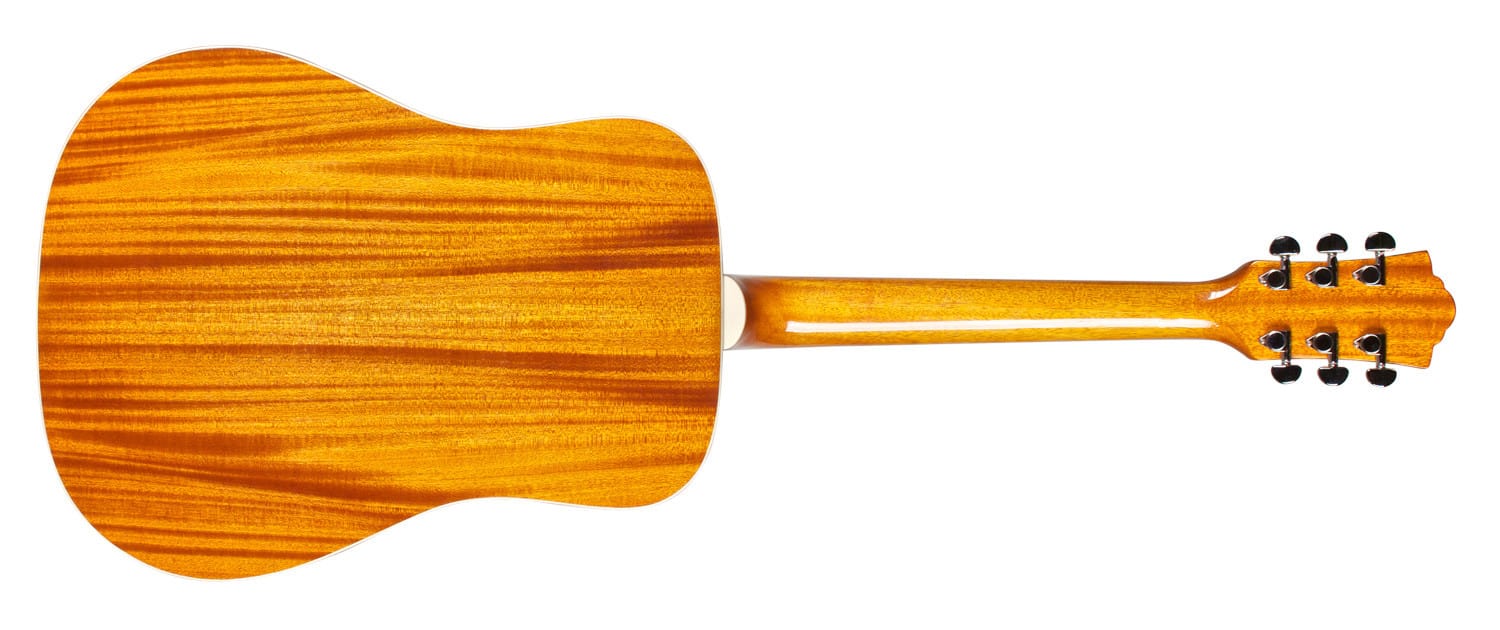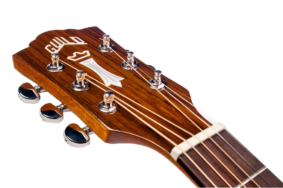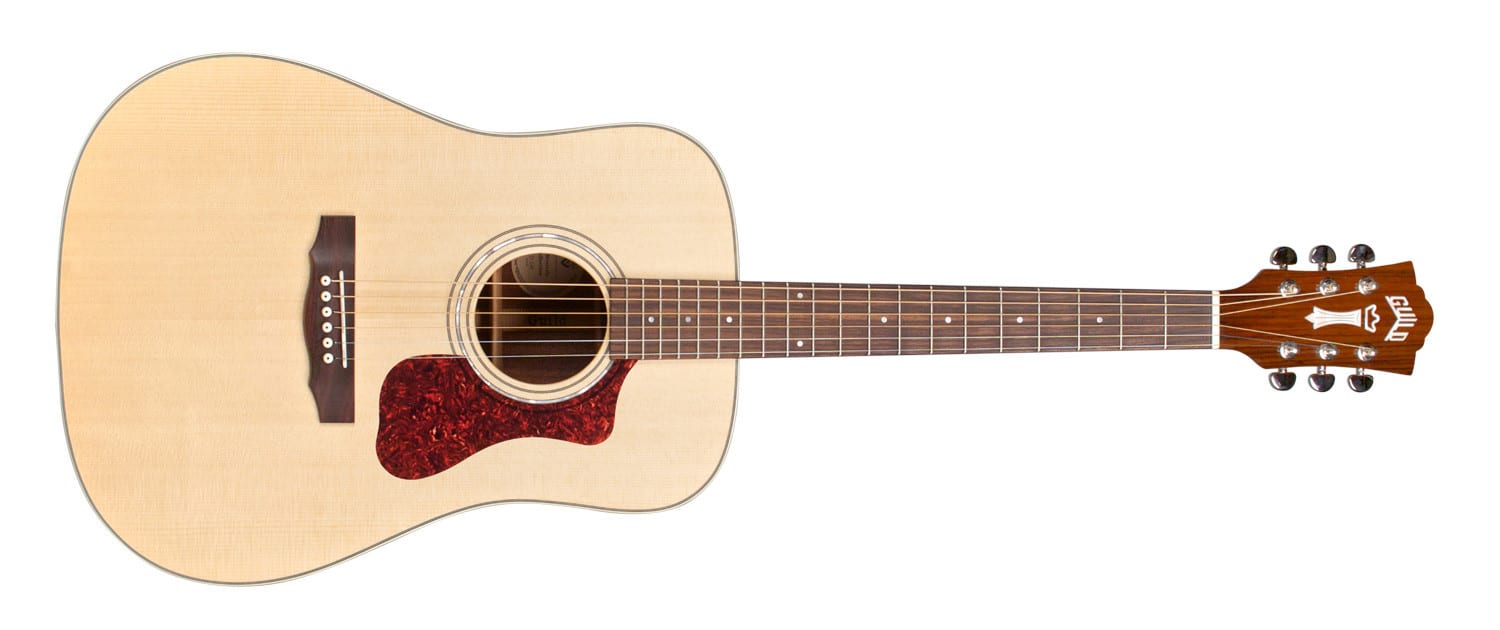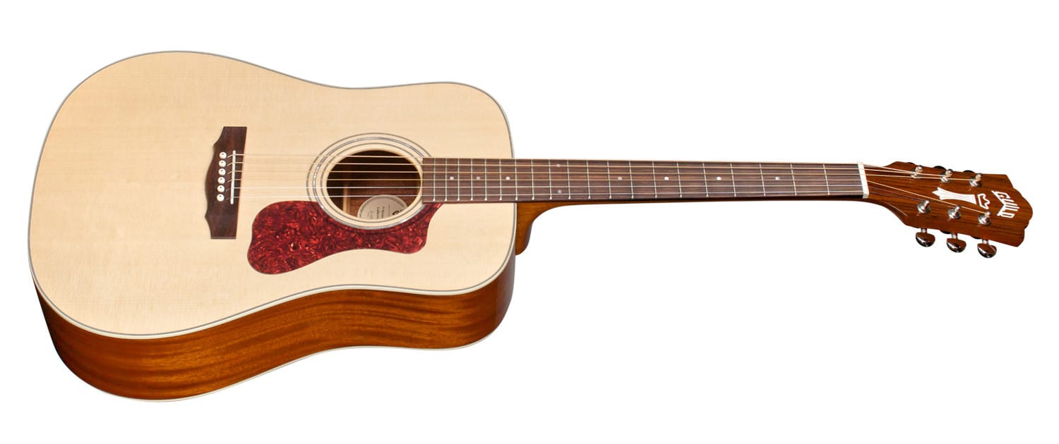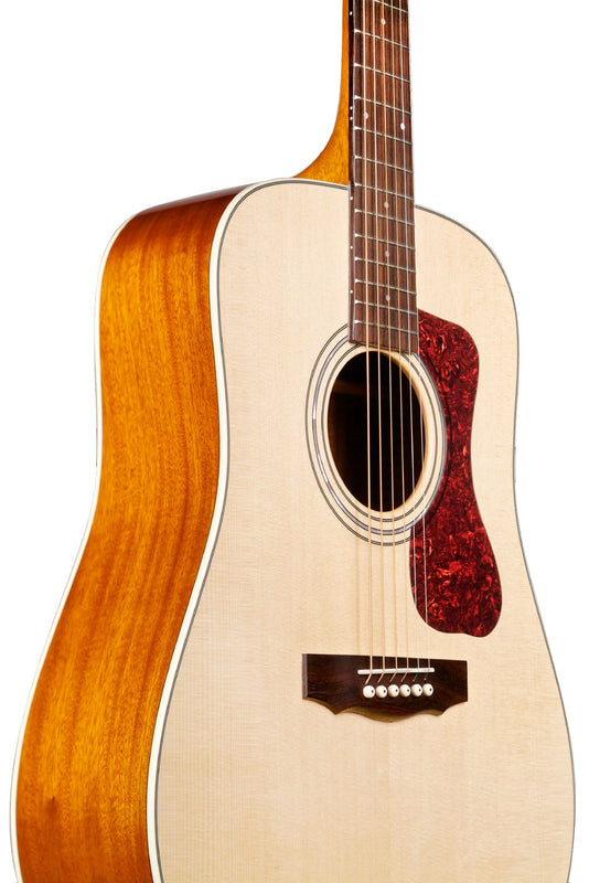 The full-bodied and powerful tone of this Guild dreadnought provides guitarists with a classic acoustic sound and balanced voicing. Built with a solid Sitka spruce top and solid African mahogany back and sides, the D-140 features an Indian rosewood fingerboard and bridge, bone nut and saddle, and a mother-of-pearl rosette. This model also has a 1¾” nut width on a vintage shaped Guild neck, iconic Chesterfield headstock emblem reminiscent of 1960s Guilds, period-correct tortoiseshell pickguard, and Guild’s new lightweight polyfoam case. Available in Natural or Antique Sunburst gloss finish.
