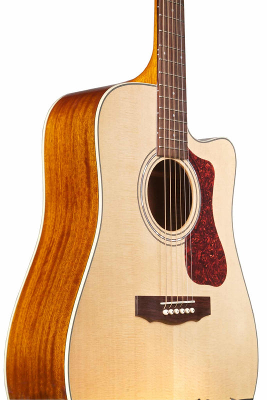 The full-bodied and powerful tone of this Guild dreadnought provides guitarists with a classic acoustic sound and balanced voicing. Built with a solid Sitka spruce top and solid African mahogany back and sides, the D-140CE also features an elegant cutaway for access to higher frets, and a hidden Guild/Fishman AP1 with Sonicore pickup. Additional features include an Indian rosewood fingerboard and bridge, bone nut and saddle, and period-correct tortoiseshell pickguard. A mother-of-pearl rosette and Guild’s iconic Chesterfield headstock emblem reminiscent of 1960s models complete the package. The D-140CE includes Guild’s new lightweight polyfoam case and is available in Natural or Antique Sunburst gloss finish.