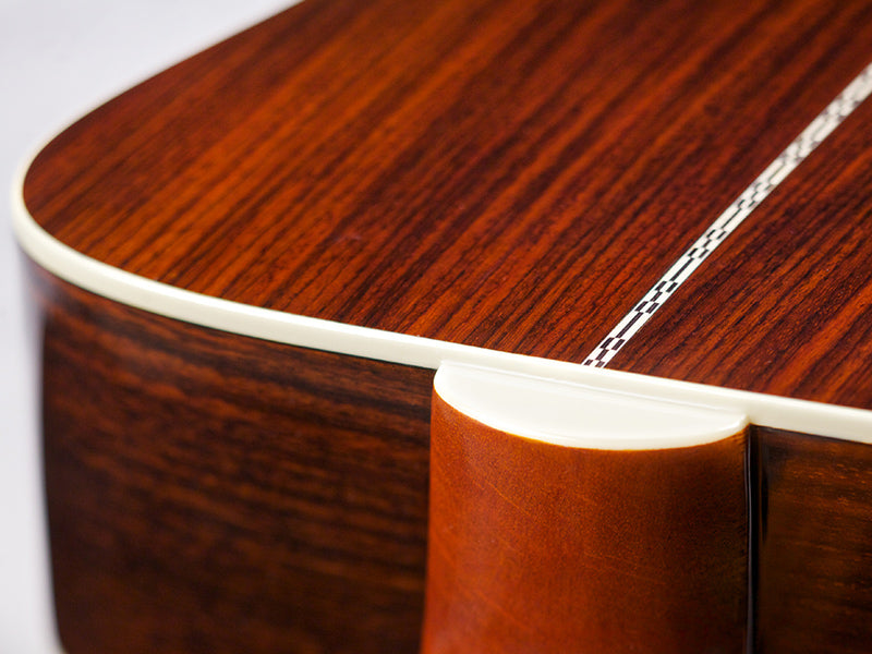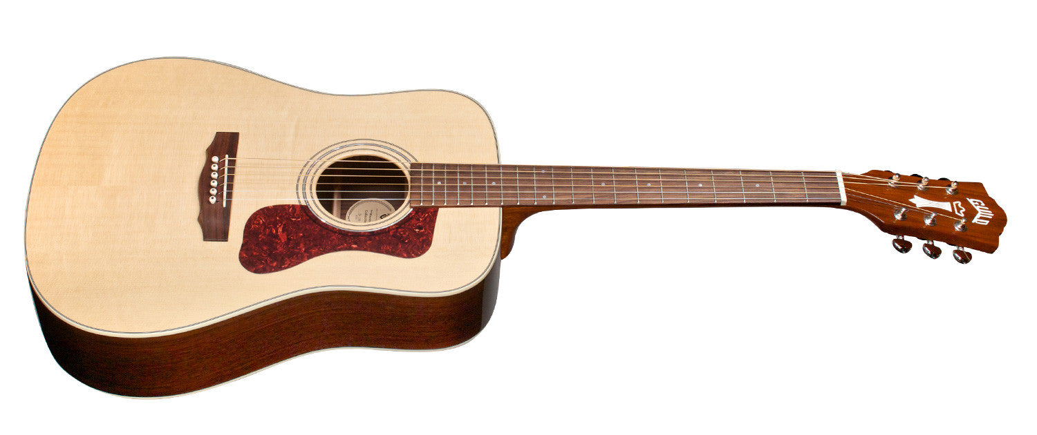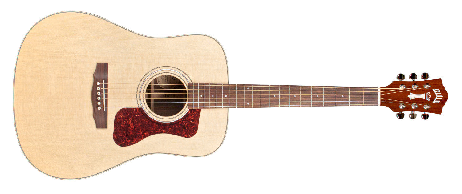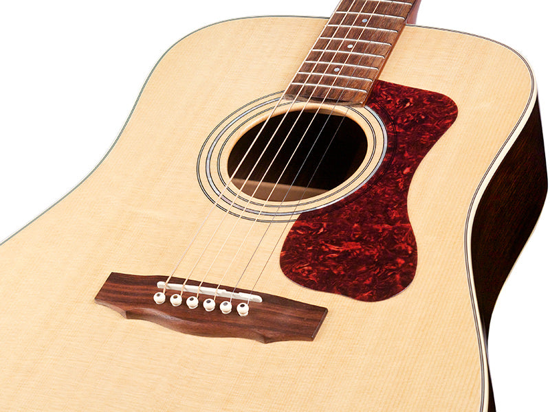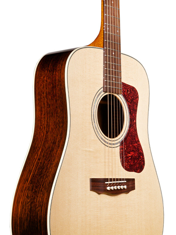 The full-bodied and powerful tone of this Guild dreadnought provides guitarists with a classic acoustic sound and balanced voicing. Built with a solid Sitka spruce top and solid Indian rosewood back and sides, the D-150 features an Indian rosewood fingerboard and bridge, bone nut and saddle, and a mother-of-pearl rosette. This model also has a 1¾” nut width on a vintage shaped Guild neck, iconic Chesterfield headstock emblem reminiscent of 1960s Guilds, period-correct tortoiseshell pickguard, and Guild’s new lightweight polyfoam case. Available in Natural gloss finish.
