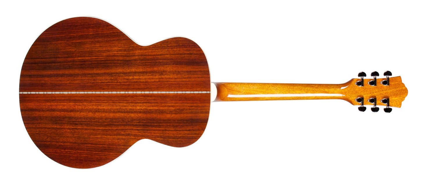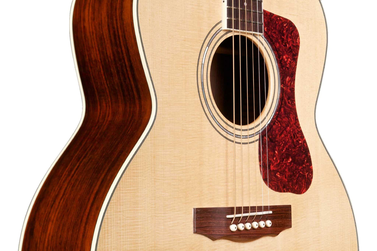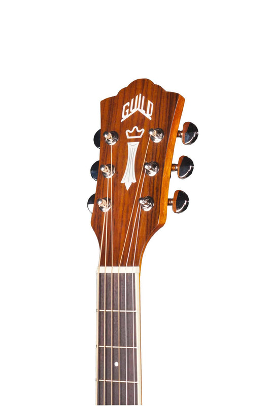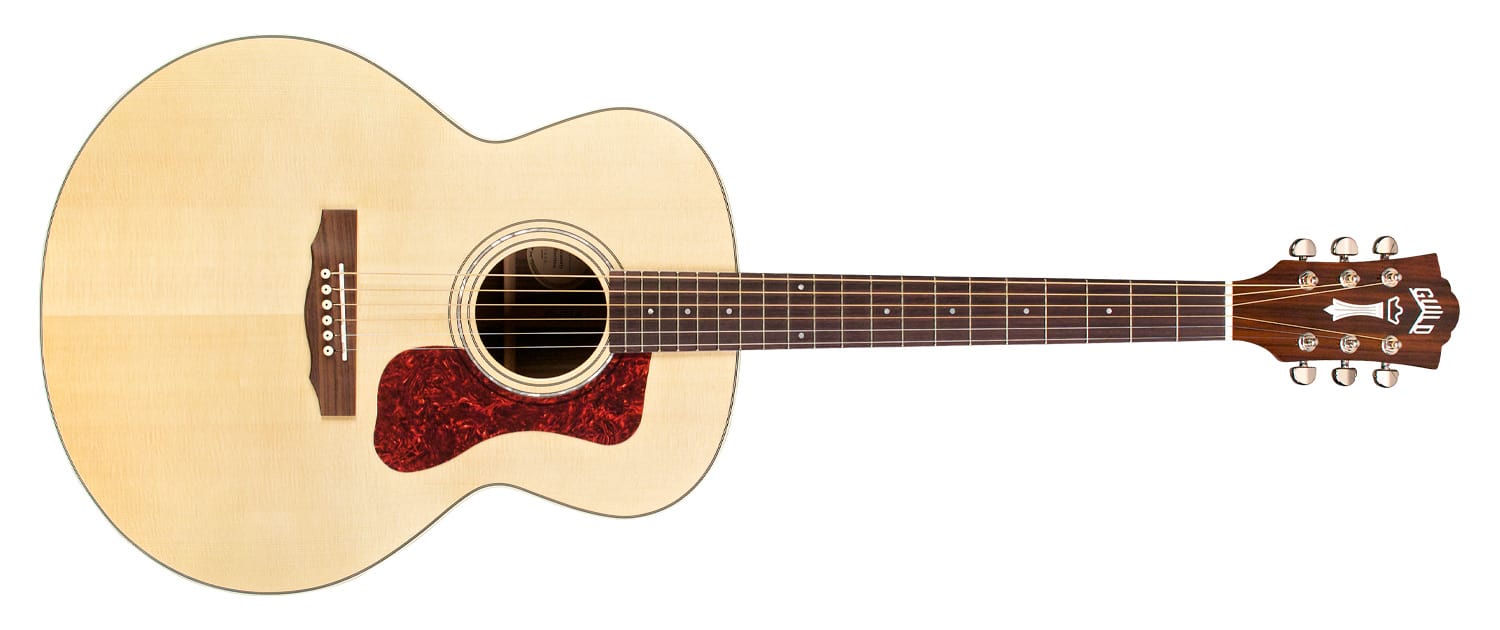 With their large, rounded bodies, Guild’s jumbo acoustic guitars have been prized for their volume, projection, and balance ever since the F-50 model debuted in 1954. The F-150 upholds this tradition with its solid Sitka spruce top and solid Indian rosewood back and sides. Additional features include an Indian rosewood fingerboard and bridge, bone nut and saddle, and mother-of-pearl rosette. This model also has a 1¾” nut width on a vintage shaped Guild neck, iconic Chesterfield headstock emblem reminiscent of 1960s Guilds, period-correct tortoiseshell pickguard, and Guild’s new lightweight polyfoam case. Available in Natural gloss finish. *This model is no longer in production*