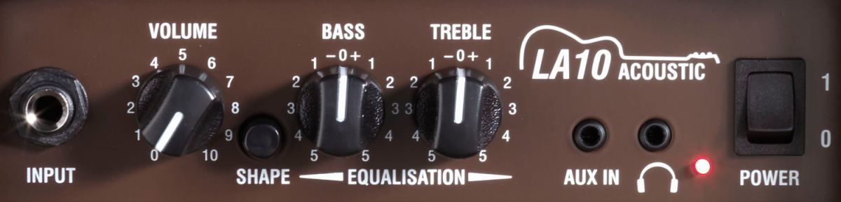 The LA10 acoustic amplifiers delivers a natural acoustic sound to complement your acoustic instrument. LA10's instrument channel features a 2 band EQ for tone shaping plus a Shape switch – this provides a great sounding “go to” setting from a single button press. The mini-jack AUX input allows for connection of a playback device such as MP3/iPod/CD for jamming along to songs or backing tracks, plus there is a headphone socket – a great feature for private practice or silent late-night sessions.