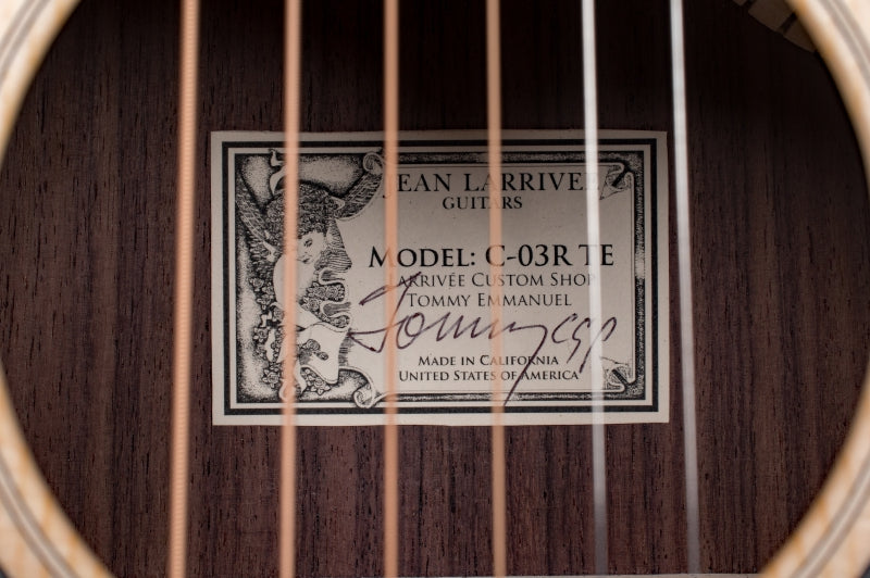 Crafted in Oxnard, California, the Larrivee C-03R-TE brings together premium materials and thoughtful design. The solid spruce top paired with solid rosewood back and sides delivers rich, resonant tones while maintaining visual appeal. Its cutaway body provides comfortable access to higher frets, making it versatile for various playing styles. This Tommy Emmanuel signature model includes a hard case for protection and comes with a label signed by Tommy himself. A genuine instrument built for players who value both sound quality and playability.