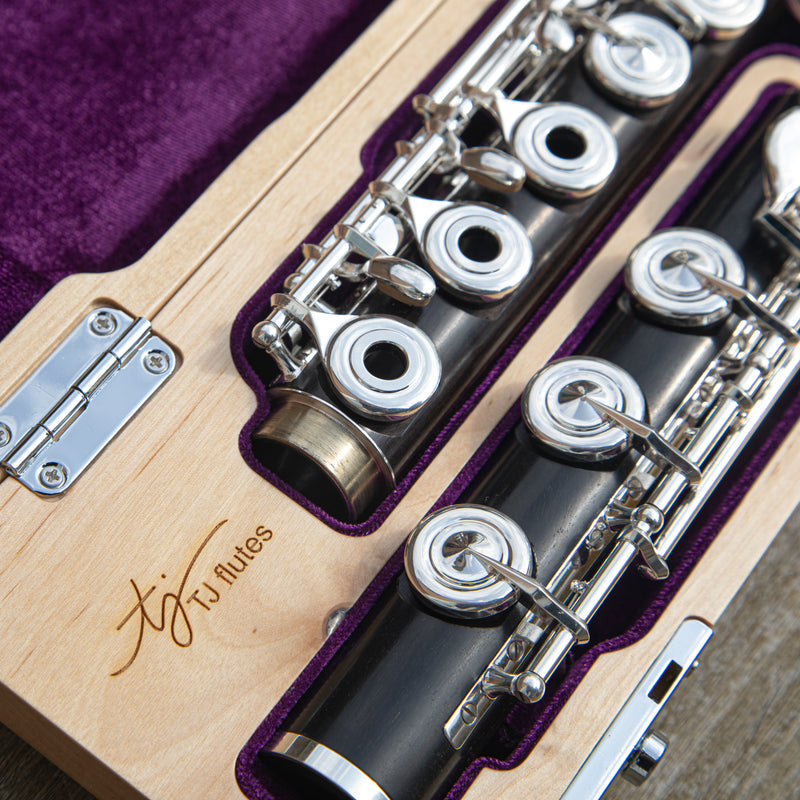 This is the beautiful free-blowing new TJ wooden flute which has been designed and crafted with a style appreciation to the wonderful wooden flute makers of past years! Made of Grenadilla, this stunning flute has a head joint hand cut and finished by English flute maker, Andrew Oxley.